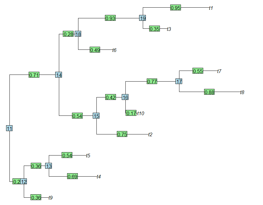 (We can see that the branch lengths of the tree, plotted as edge labels, line up exactly with the branch names in tree$edge.length. Cool.)